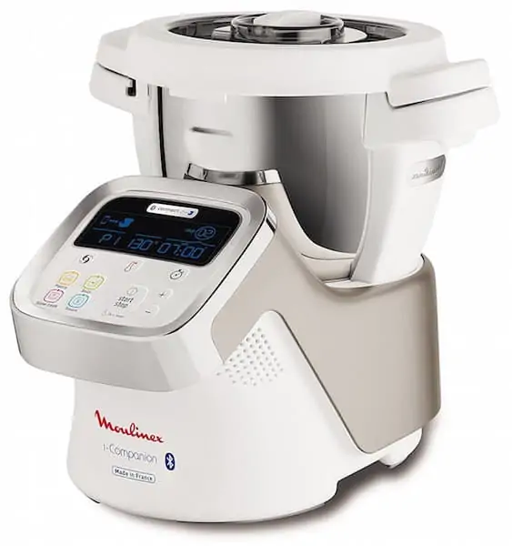 Quelles fonctionnalités pour cet appareil Moulinex i-Companion HF9001 ? C’est une version connectée de robot cuiseur. La puissance est de 1550 W et la capacité totale de 4,5 L. Il dispose d’un écran LCD, d’une minuterie, d’un départ différé et d’une fonction maintien au chaud. Egalement disponibles, des modes automatiques et un mode manuel.
